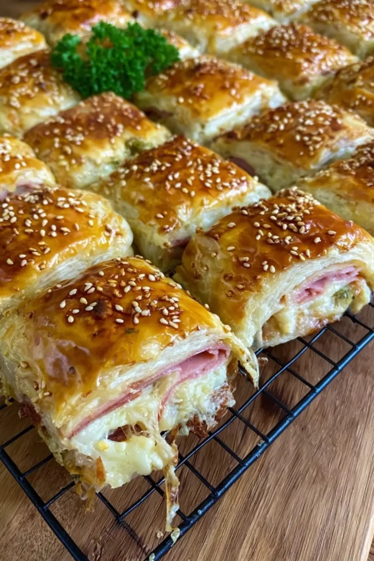 Blätterteig gefüllt mit Schinken und Käse ist ein schneller, herzhafter Snack für jede Gelegenheit. Knusprig, cremig und voller Geschmack – ideal für Partys, Mittagessen oder als Fingerfood.