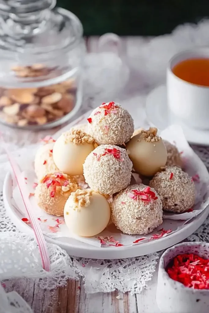 - Die Hälfte der Kugeln in Kokosraspeln wälzen und leicht andrücken.