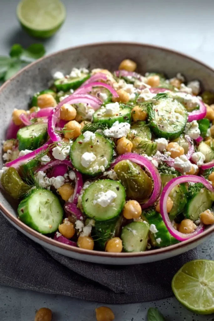 Ein frischer, leichter und zugleich sättigender Gurkensalat mit Kichererbsen und Feta – perfekt für warme Tage oder als gesunde Beilage. Die Kombination aus knackiger Gurke, cremigem Feta, nussigen Kichererbsen und einem erfrischenden Limetten-Honig-Dressing bringt mediterranes Flair auf den Teller.
